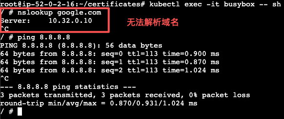 2. 开启busybox, 然后进入container内执行ping和nslookup,在还没装之前是完全无法从域名解析ip的