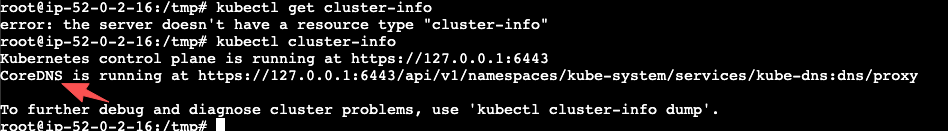 我们如果重复check cluster info的话就会看到CoreDns的信息了