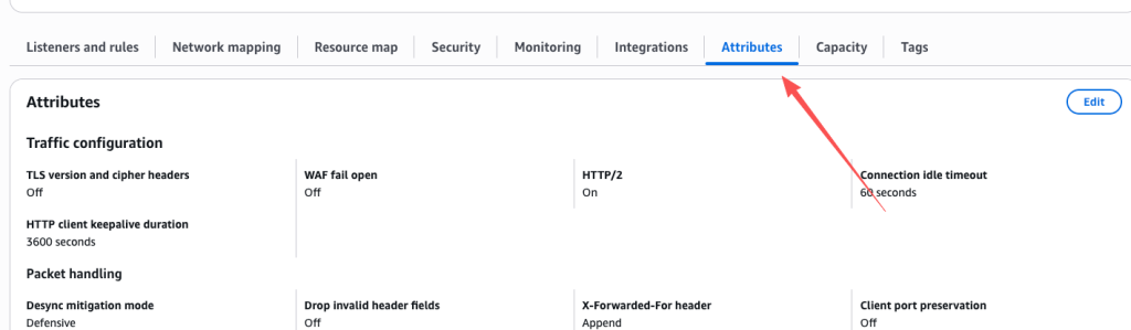 3. 去到ALB Detail Page ,点击Attributes tab 然后点击Edit
