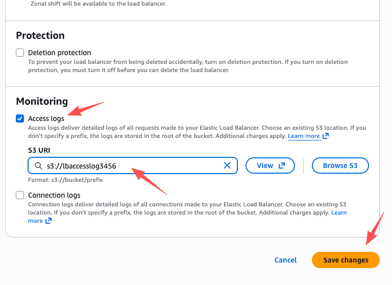 4. 勾选Access Logs 然后选择这你的S3 Bucket 最后就保存,那么成功了!
