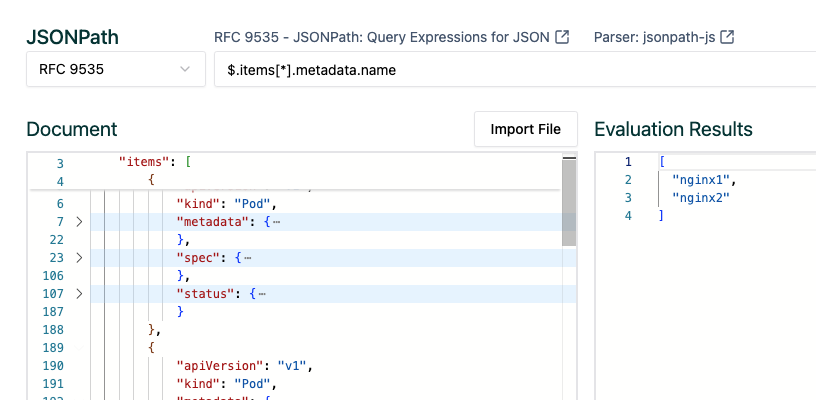 3.使用jsonpath evaluator , 来把json资料extract出来,我们现在制作的是从json输出pod name