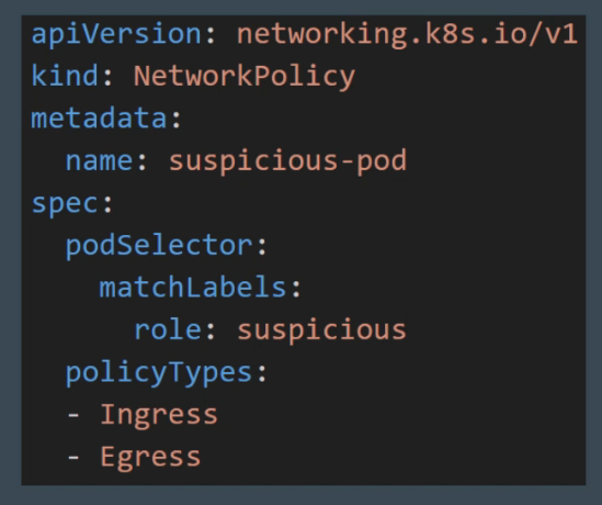 这个例子就是把所有拥有role=suspicious的pod都给关联起来,并且禁止任何的ingress和egress流量。