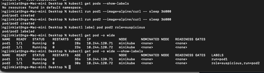 2. 创建pod1和pod2 , pod2 绑定了label role=suspicious