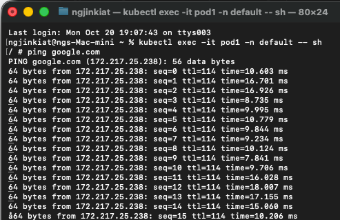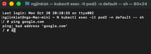 4. 进入pod 1 和 pod 2 去 ping google.com , 按理来看的话pod2受限所以是无法ping的