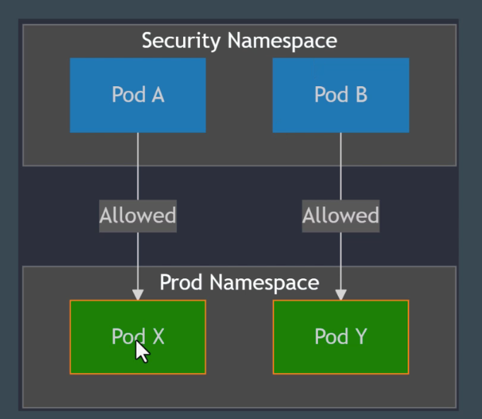 根据这个例子,比如你有多个namespace,但是在production namespace 你只允许Security namespace访问而已,其他所有的namespace都无权访问。