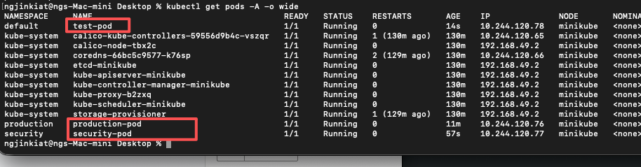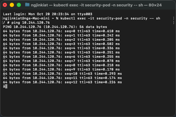 6. 进入security-pod 和 test-pod 内,然后去ping production-pod的ip