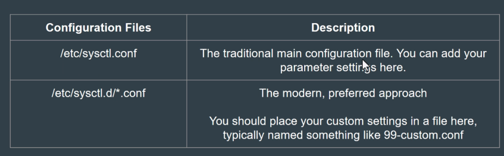 可以在sysctl.conf文件当中添加你想要改的内核参数,但是会比较建议在 /etc/sysctl.d/ 目录当中创建新文件,然后添加你想要改的内核参数