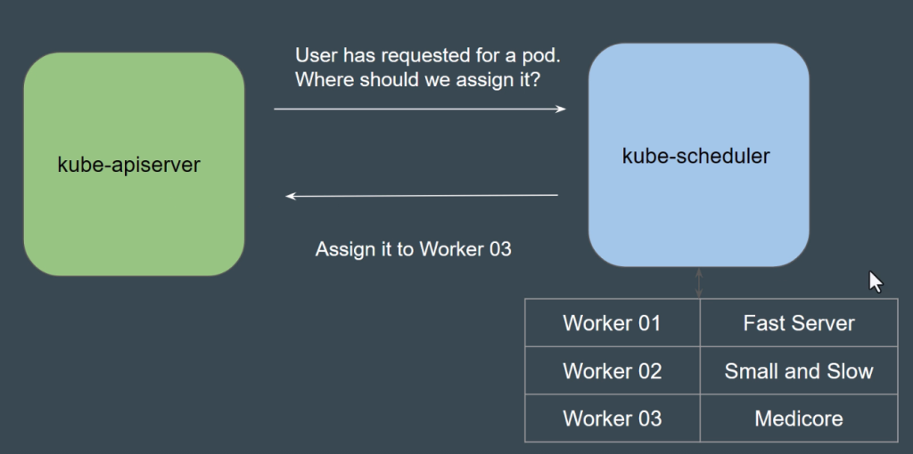 Kubernetes当中的Scheduler的作用就是安排pod在哪个node部署, 然后就会告知apiserver ,接着apiserver就会让kubelet去部署。