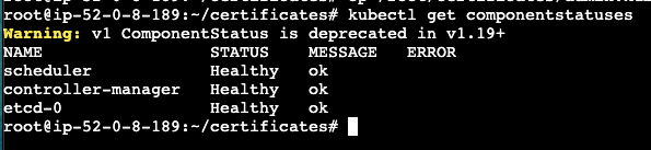 4. 检查component status , 这个 componentstatuses 已经在 k8s v1.19 淘汰了