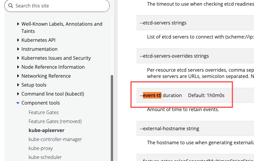 根据K8s的官方文档event 默认存储是存放1小时,超过1小时就删除了,这避免了master node的容量爆炸,因为所有的event日志都是存在master node的。